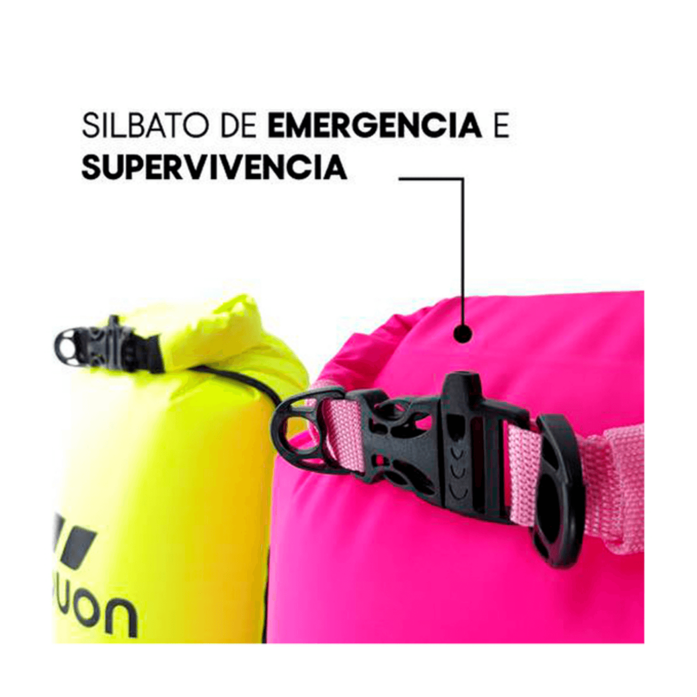 La bolsa seca o dry bag debe cerrarse primero juntado ambas caras de los lados internos de la boya y luego enrollando 3 veces, Finalmente, se cierra uniendo la hebilla, Esta hebilla, es a la vez un silbato de emergencia y supervivencia,