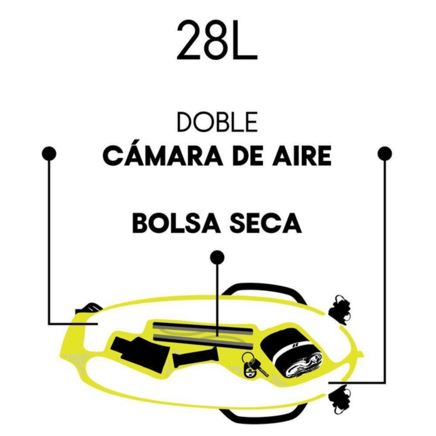 Con un volumen de 28 litros, esta boya posee un compartimento estanco o dry bag que le permite llevar consigo al nadador cualquier objeto personal, como llaves, ropa, toallas, geles, ojotas, etc, Es importante no introducir objetos cortantes o con punta para evitar agujerar el material de la boya,