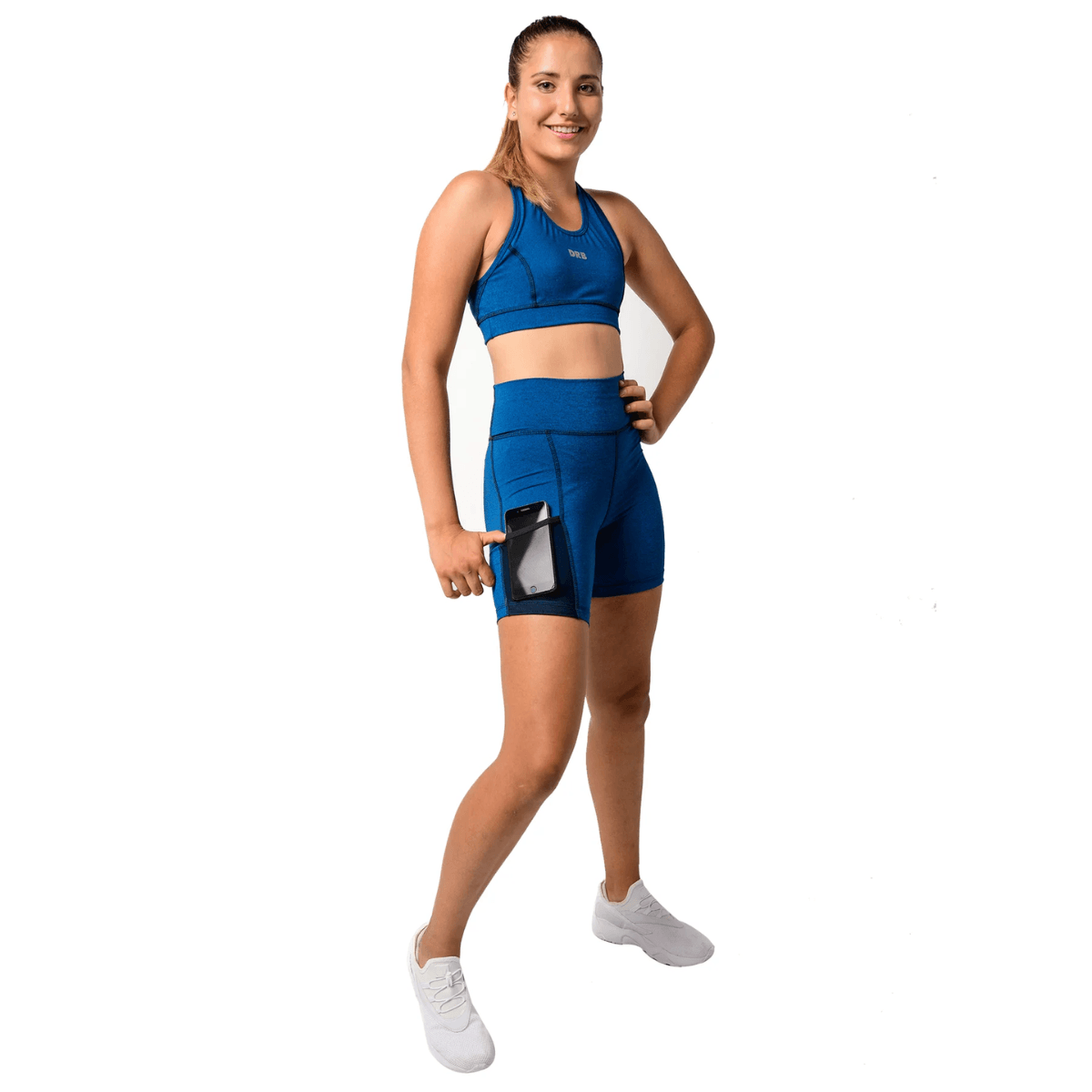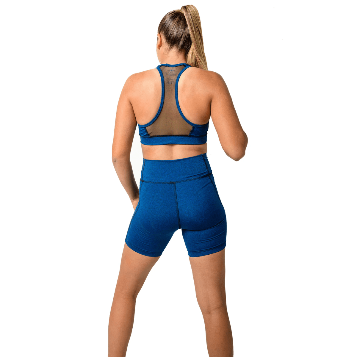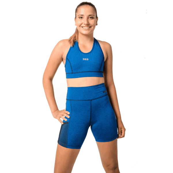 El modelo de calza corta Ocean, está confeccionada en suplex jaspeado de color azul y contiene un práctico bolsillo lateral en microtul negro.