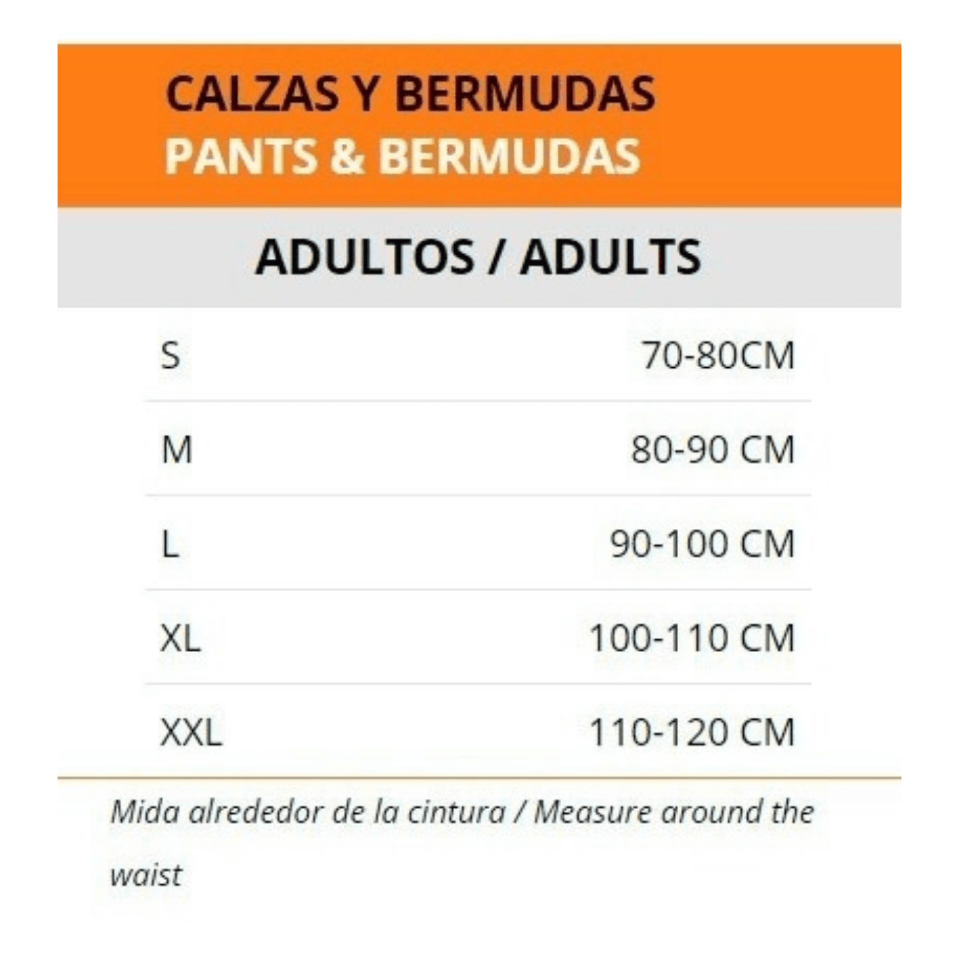 – XXL: Largo: 47 cm – Cintura: 37 cm – Tiro: 27 cm