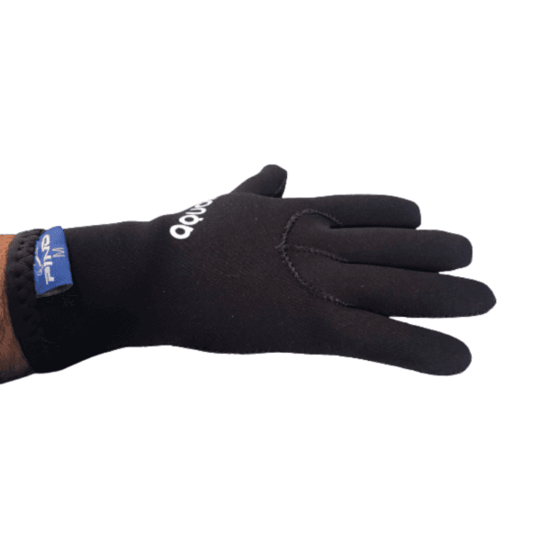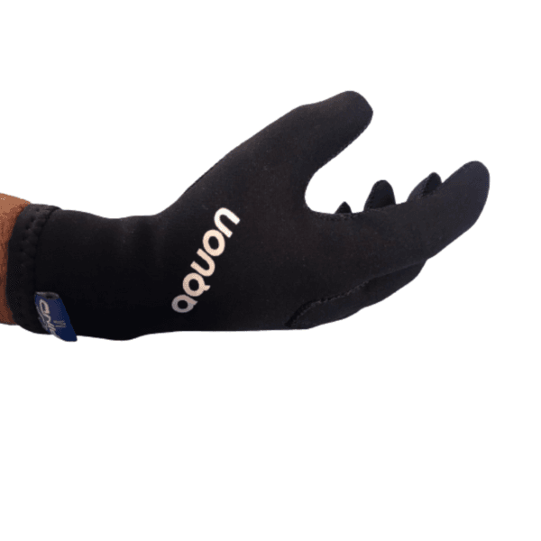 Guante de puño corto fabricado con neoprene de 2mm de espesor y engomado por fuera en su cara externa para la práctica de natación en aguas abiertas.