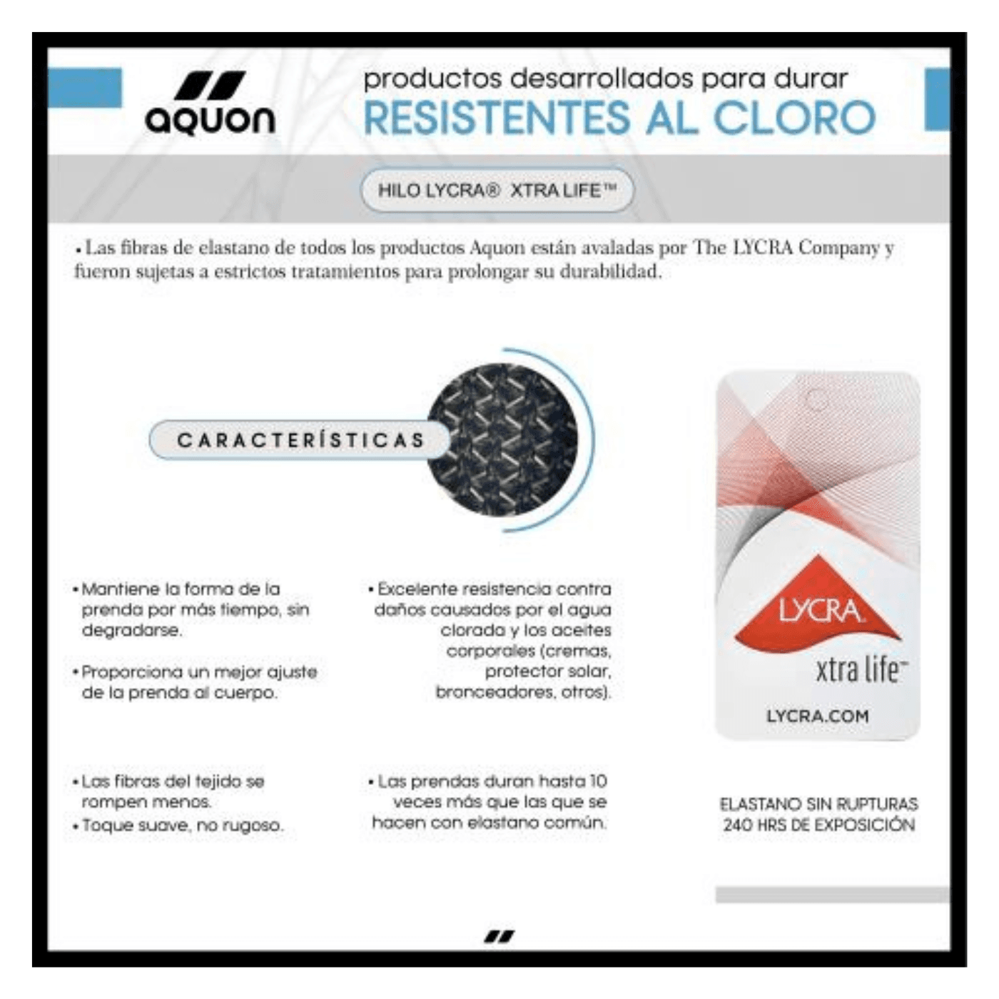 Está confeccionada con un tejido elástico de alta calidad. Las fibras de elastano de todos los productos Aquon están avalados por The Lycra Company® y fueron sujetas a estrictos tratamientos para prolongar su durabilidad y garantizar la protección UV.