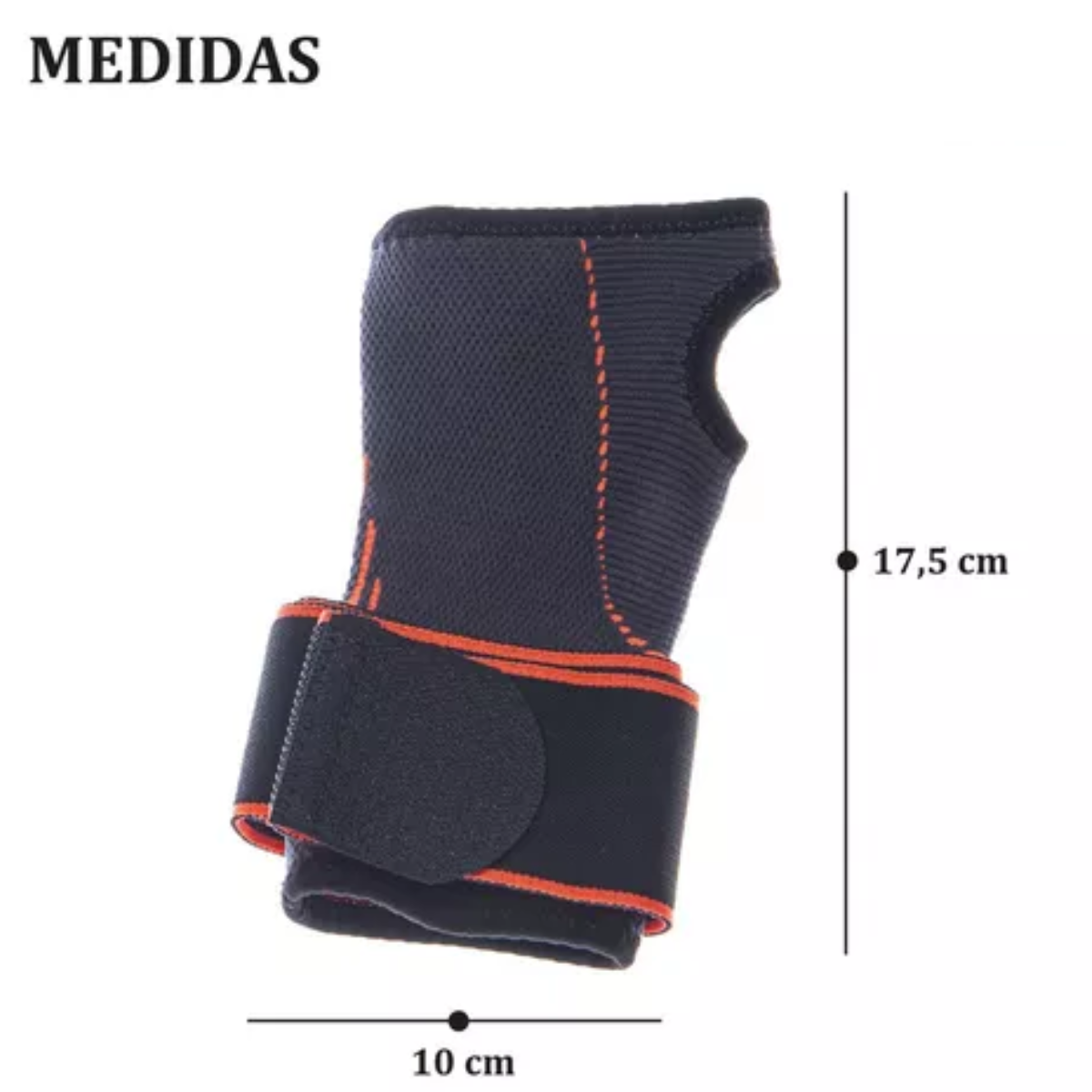 – Material: Muñequera dedo pulgar confeccionada en tejido de punto transpirable y elástico, sin costuras para evitar rozaduras. Cinta elástica de neoprene para ajuste individual.