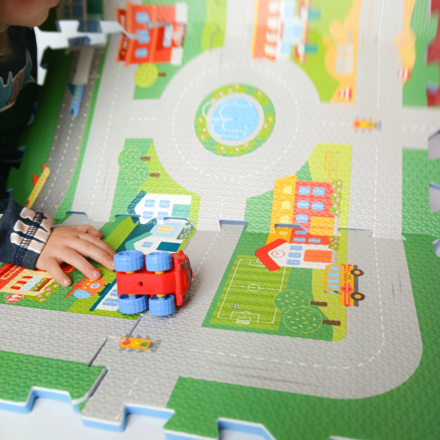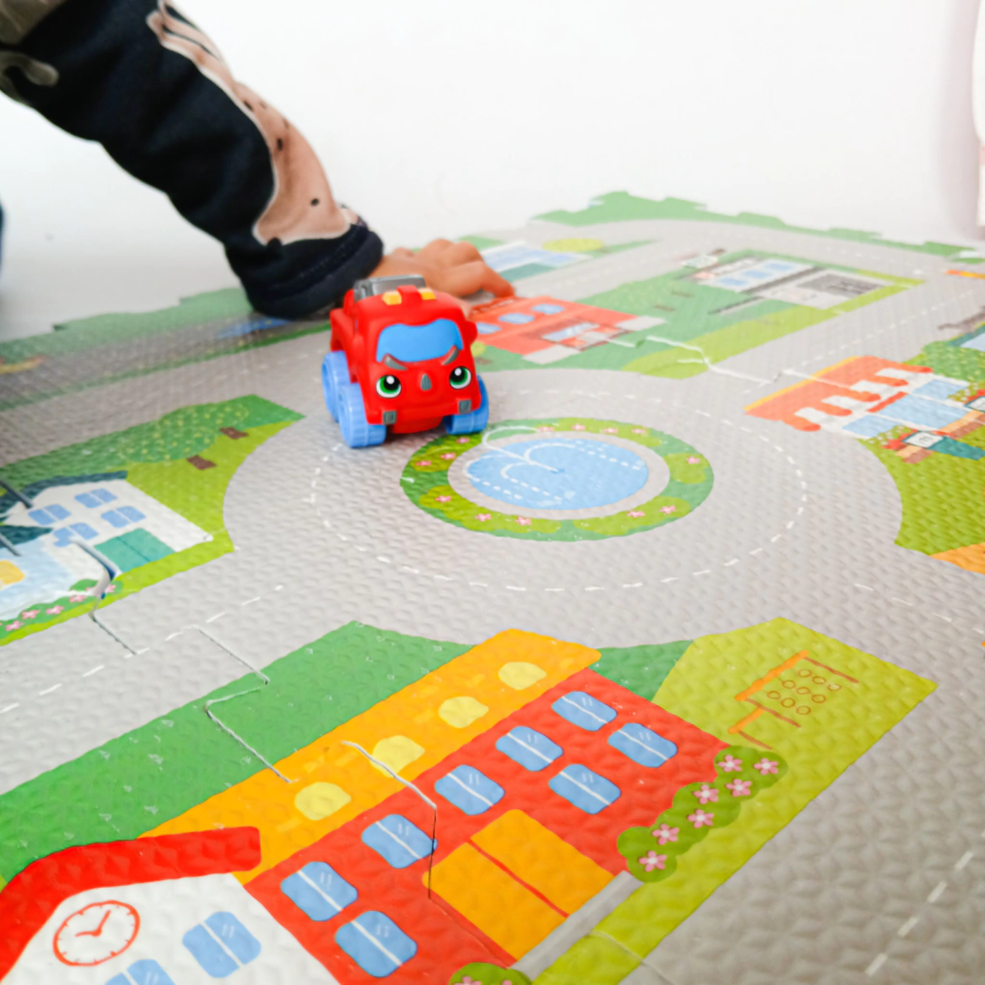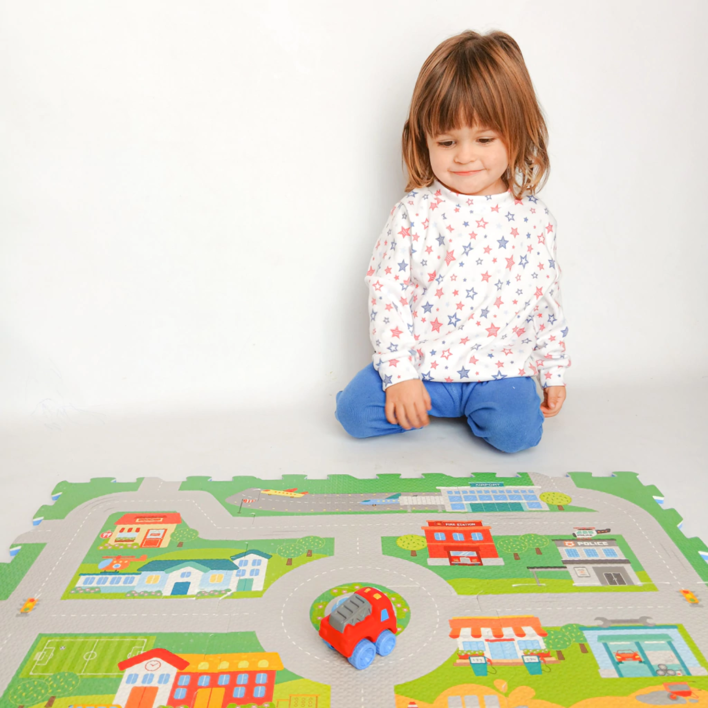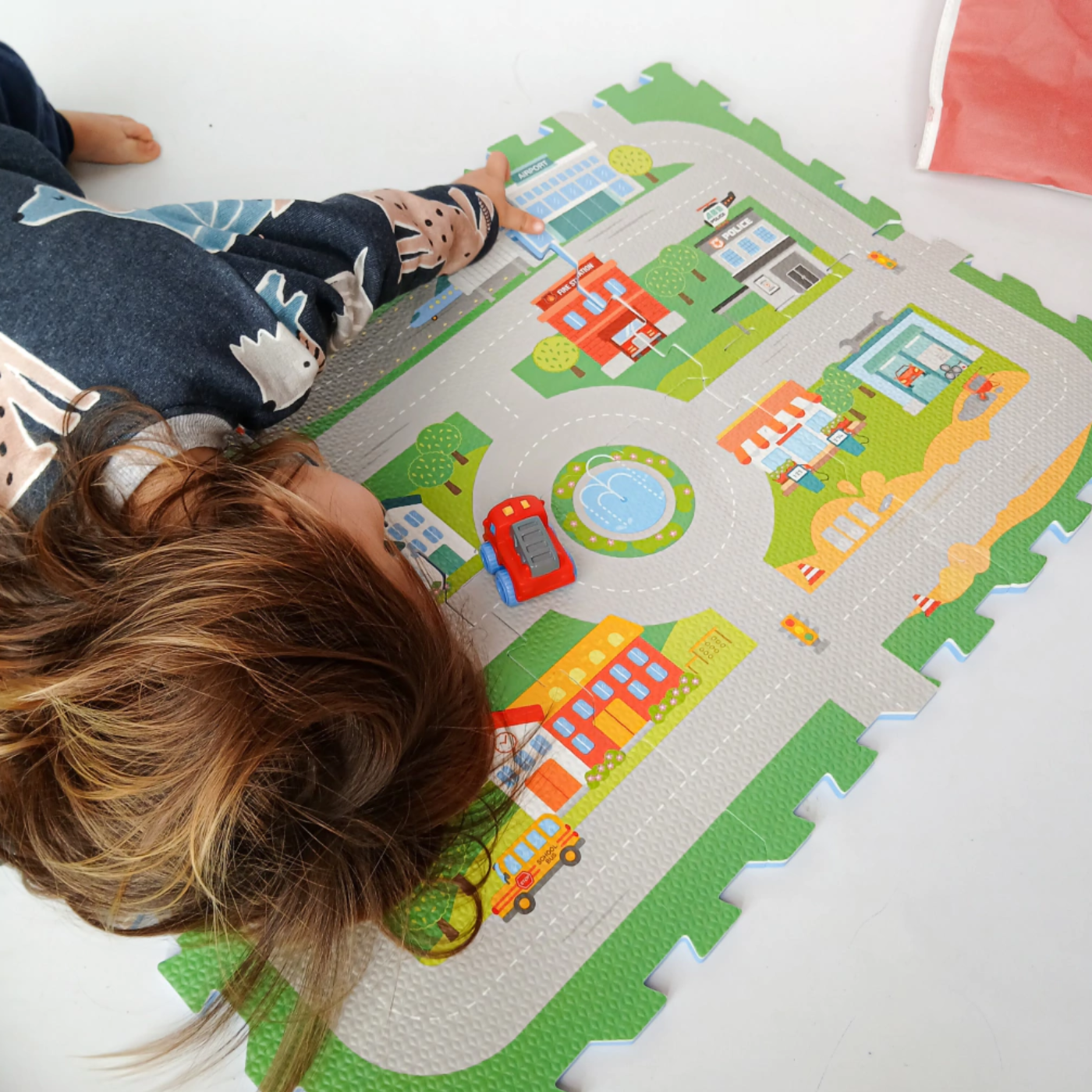 Una alfombra de goma eva divertida, estimula el juego y la exploración! Con un diseño urbano y un autito incluido, invita a crear historias mientras los mas peques desarrollas motricidad e imaginación.