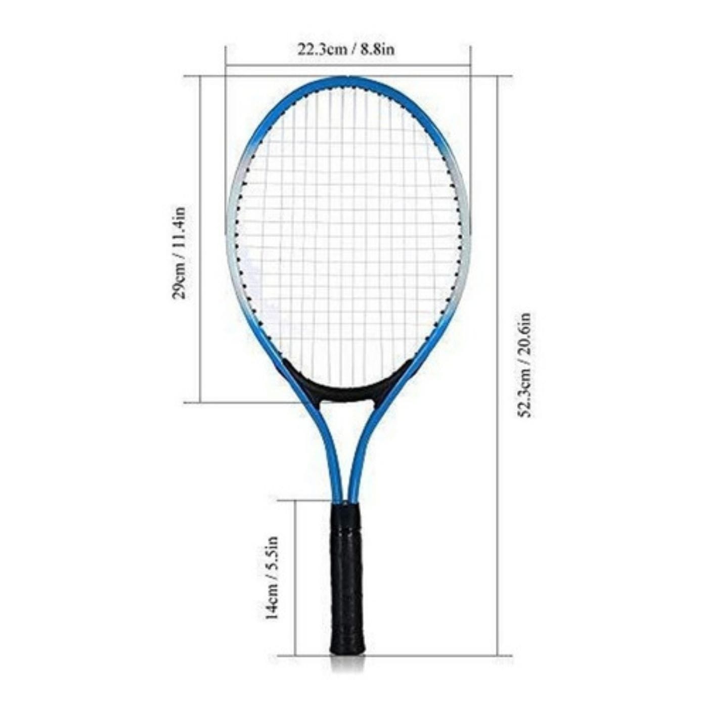 Medidas de la raqueta: 52,3 cm de largo total. 22,3 cm ancho. y 14 cm mango.
