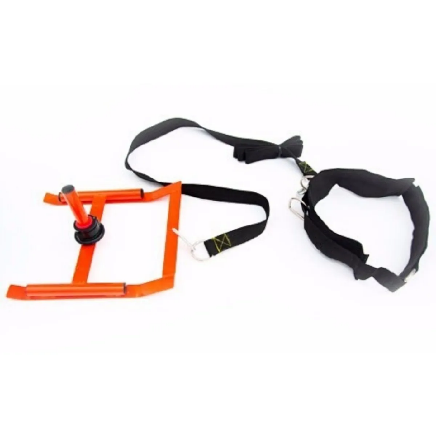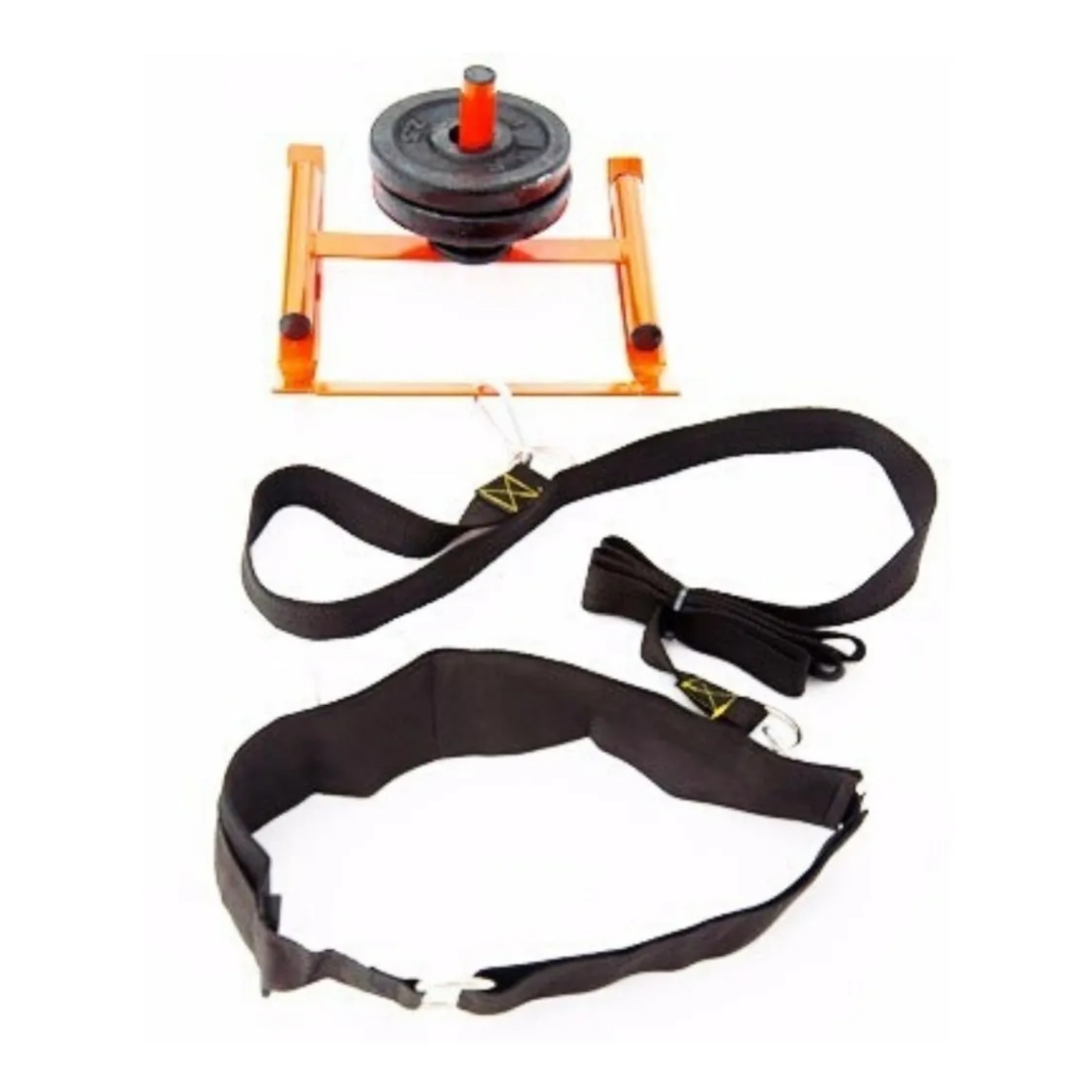 – Incluye cinta de agarre de 2,5 metros que une al cinturón regulable con el trineo y tope para colocación de discos.